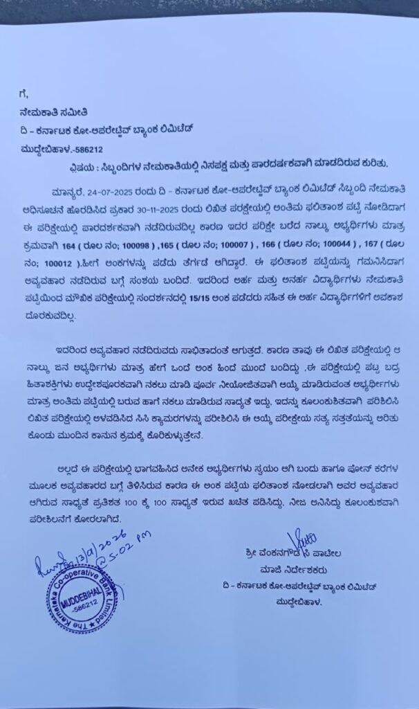 ಸುನಾಮಿ ನ್ಯುಸ್ ಮುದ್ದೇಬಿಹಾಳ(Muddebihal) : ದಿ.ಕರ್ನಾಟಕ ಕೋ.ಆಪರೇಟೀವ್ ಬ್ಯಾಂಕ್ ಲಿಮಿಟೆಡ್ ಇವರು ಸಿಬ್ಬಂದಿಗಳ ನೇಮಕಾತಿಗಾಗಿ ನಡೆಸಿದ ಪರೀಕ್ಷೆ ಬಗ್ಗೆ ಅಪಸ್ವರ ಕೇಳಿ ಬಂದಿದೆ. ಪರೀಕ್ಷೆ ಪಾರ್ದರ್ಶಕವಾಗಿ ನಡೆದಿಲ್ಲಾ ಜೊತೆಗೆ ಪರೀಕ್ಷೆಯ ಅಂತಿಮ ಫಲಿತಾಂಶದಲ್ಲಿ ಅವ್ಯವಹಾರ ನಡೆದಿದೆ ಎಂದು ಬ್ಯಾಂಕ್ ಮಾಜಿ ನಿರ್ದೇಶಕರಾದ ವೆಂಕನಗೌಡ ಸಿ ಪಾಟೀಲ್ ಅವರು ನೇಮಕಾತಿ ಸಮೀತಿಗೆ ತನಿಖೆಗೆ ಆಗ್ರಹಸಿ ಮನವಿ ಸಲ್ಲಿಸಿದ್ದಾರೆ.